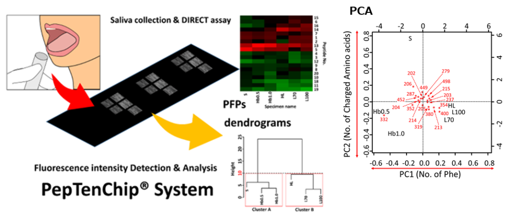This study aimed to develop a biochip capable of objective oral-health assessment independent of the dentist’s skill, conducting experiments using disease-model saliva. Fabrication of the peptide microarray, an amorphouscarbon substrate, modified with carboxyl groups across three blocks, was derivatized with EMCA. Subsequently, peptide probes as capturing materials for periodontal disease testing were arrayed using a microarrayer. Assay by this microarray allows detection of disease-model saliva. Twenty peptide probes that exhibited significant changes in fluorescence intensity were identifies from selection of ca 500 of α-helical peptides as characteristic capturing materilas for periodontal disease. Peptide Finger Printing (PFP) analysis of the resulting fluorescence intensity data revealed specific patterns for each sample. Furthermore, cluster analyses using dendrograms demonstrated that samples could be clearly classified based on their unique characteristics. Principal Component Analysis (PCA) of the fluorescence changes also provided insights into the properties and sequences of the peptides involved in recognition. These results indicate that this chip can distinguish differences in protein composition with high precision, proving its objective utility for testing of periodontal disease. Peptide microarrays such as PepTenChip® are suitable for the comprehensive analysis of peptides interacting with specific proteins. By optimizing the selection of immobilized peptides, this system is expected to diagnostic applications to a wide variety of clinical samples.